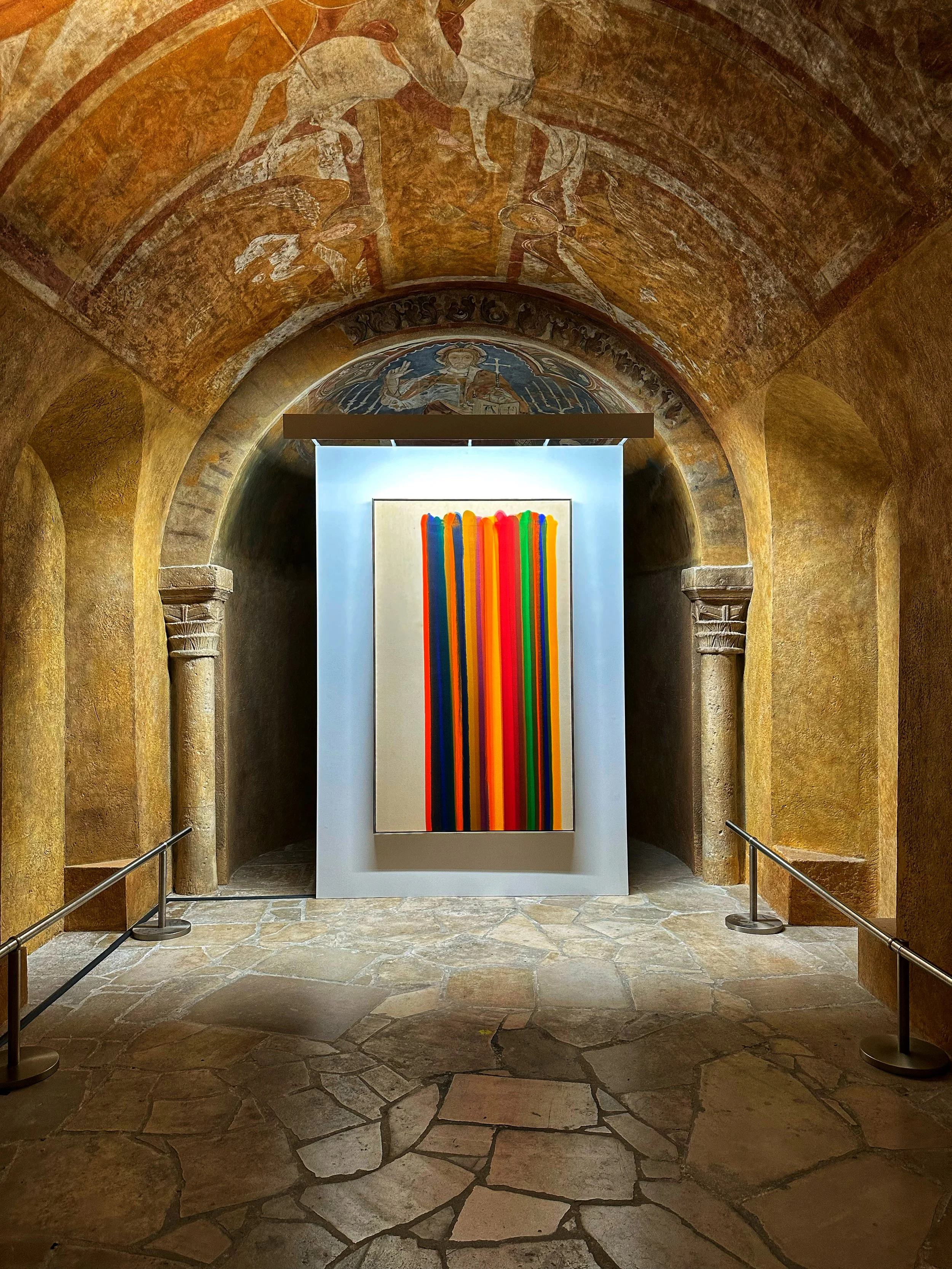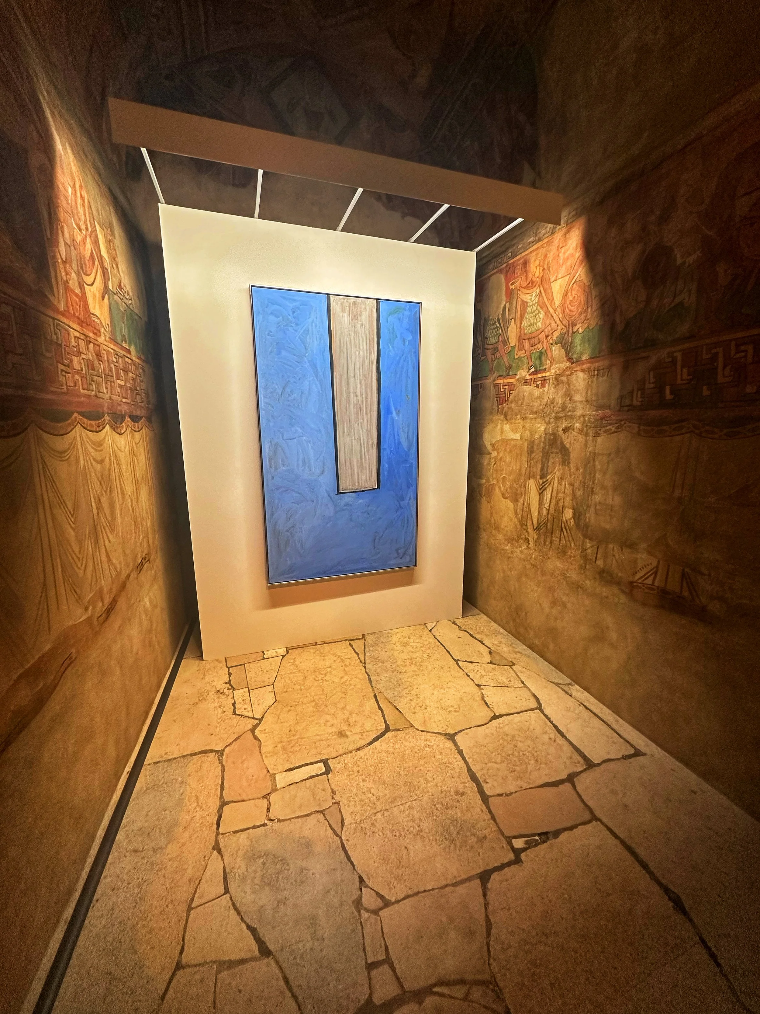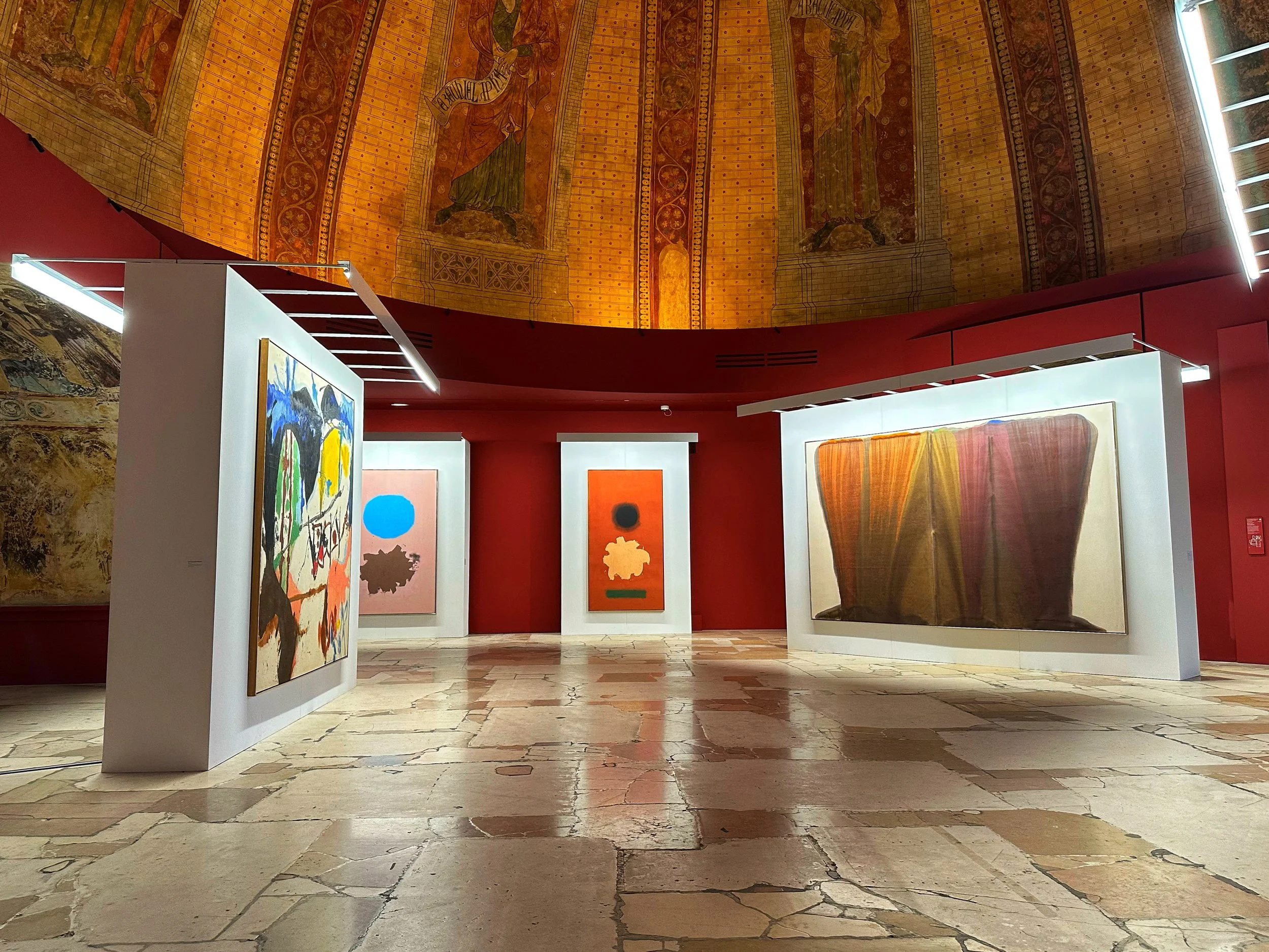 The museum contains reproductions of statues, porticoes, and other architectural features from historic monuments. On its top floor there’s a warren of windowless galleries with reproductions of frescoes. One of the galleries is under a high domed ceiling. Other galleries are reminiscent of monks’ cells, being “constrained and restrained.” Along these galleries, the museum put on a show of twenty-three Color Field paintings—large works in which the canvas is dominated by blocks or splashes of color. The artists included Robert Motherwell, Morris Louis, and Helen Frankenthaler, among others.
