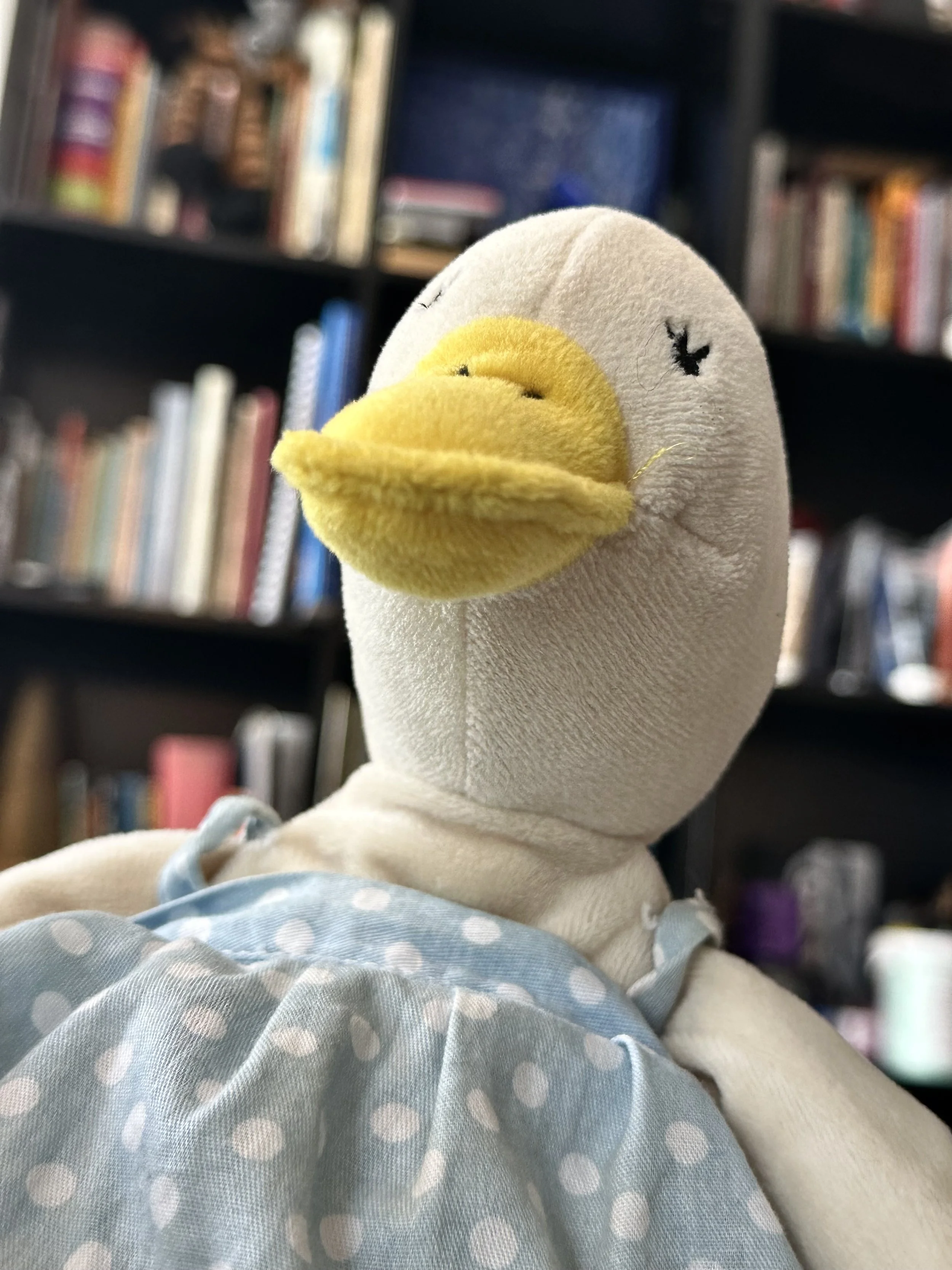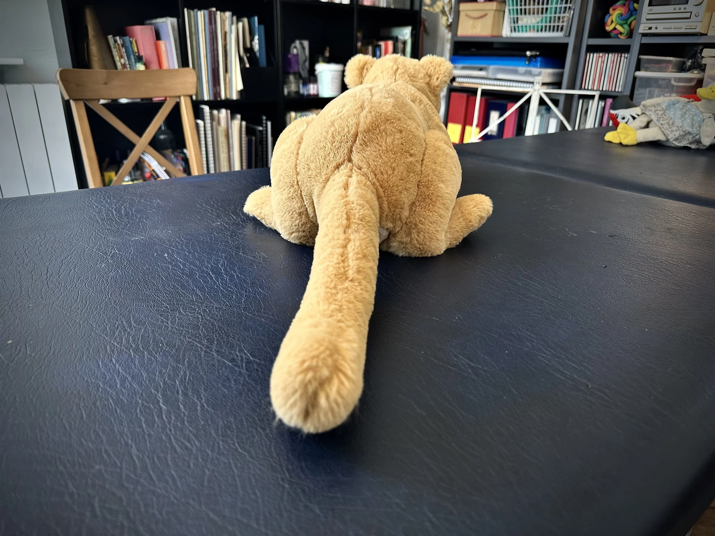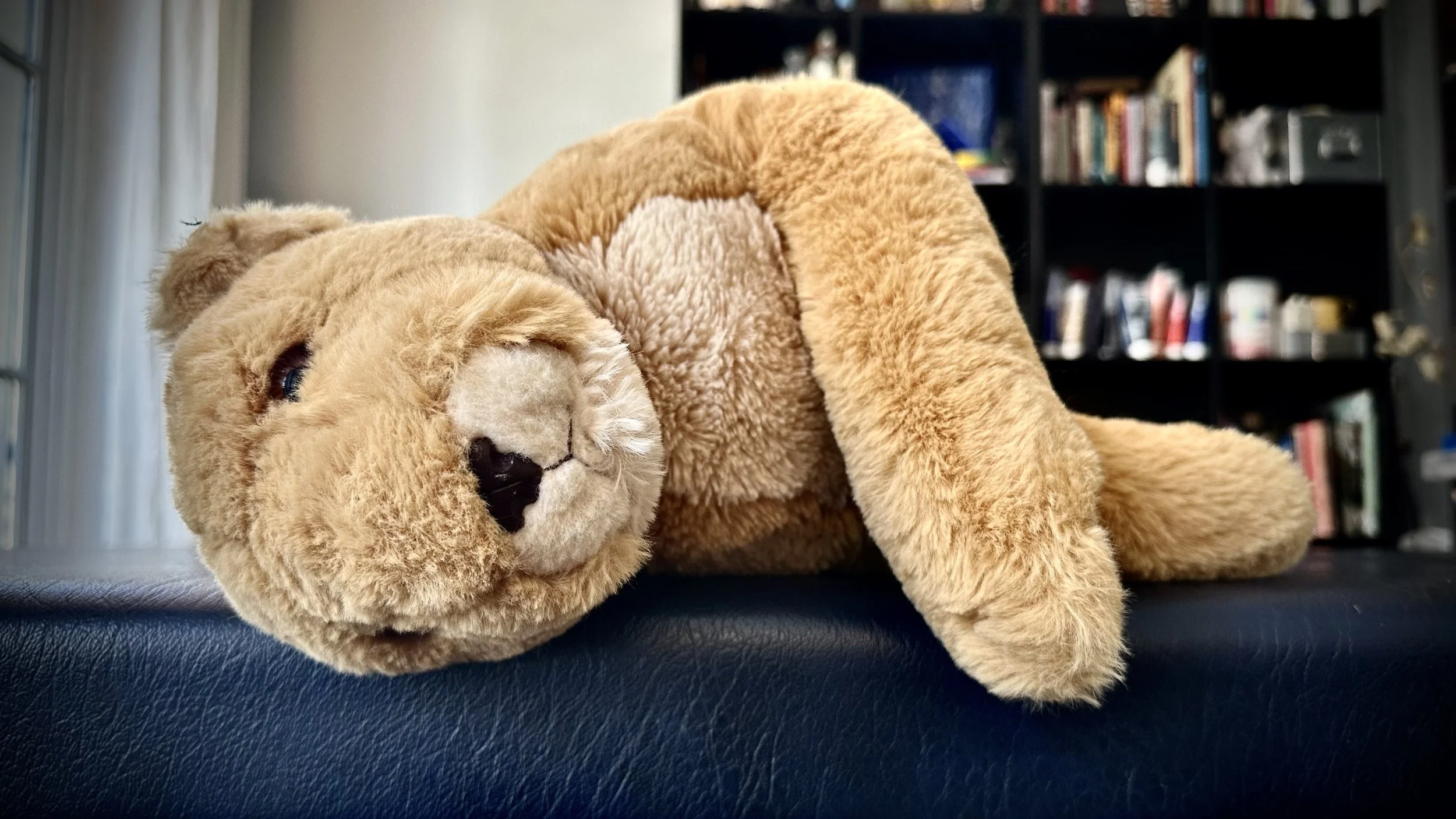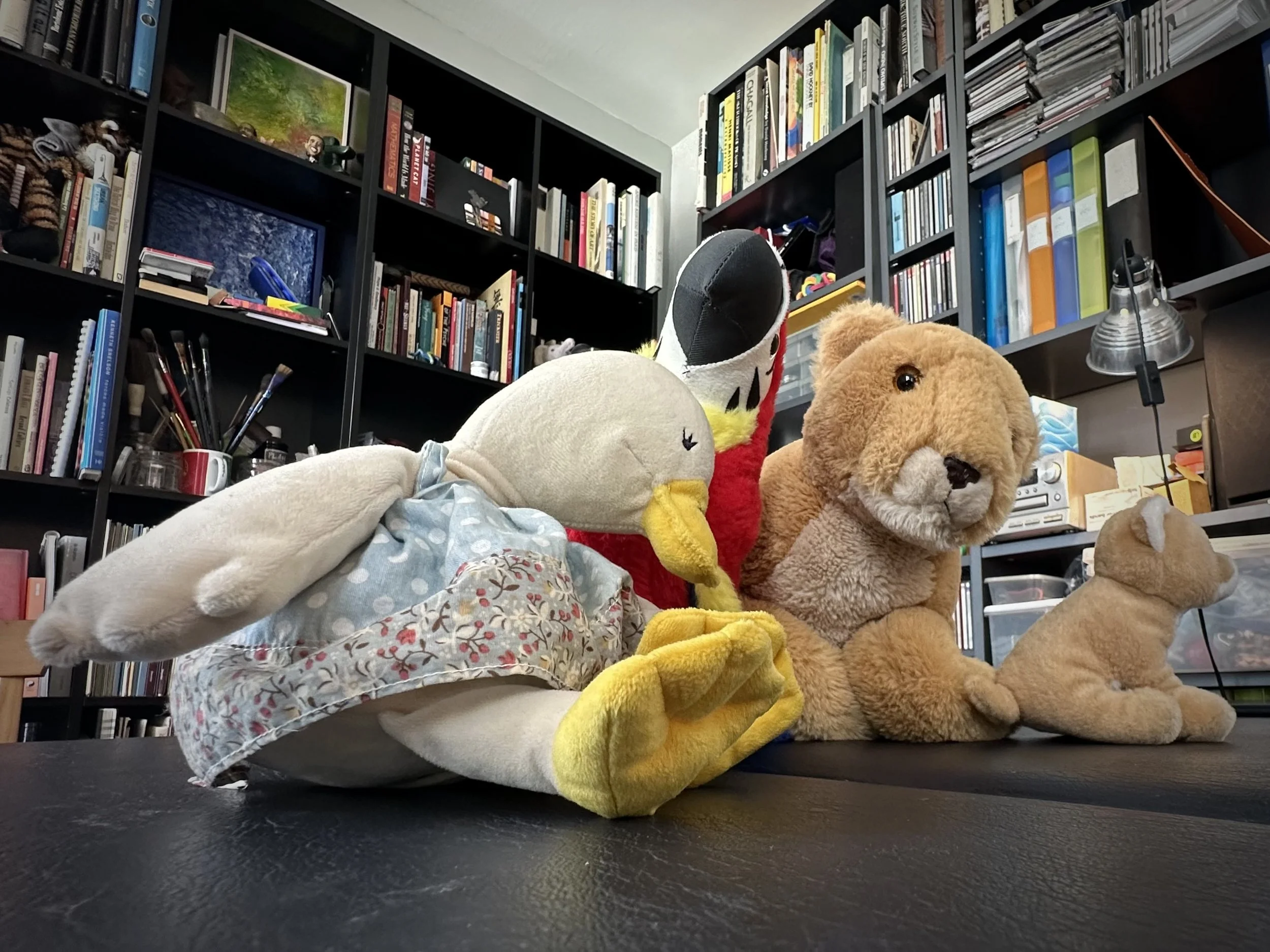 My wife and I don’t have children. We also don’t have a cat or a dog—I mean, a live, flesh-and-blood pet. But we do have stuffed toys; many; a whole menagerie. Lion, tiger, duck, elephant, and assorted ambiguous entities. Some are palm-of-the-hand little, others are big enough to encompass most of your belly and chest when you and the toy are reciprocally recumbent (r&r). The toys have names, personalities, quirks. When we audition new candidates for the menagerie, we test them for squeezeability, cuteness, sad-making eyes, and fluff.
